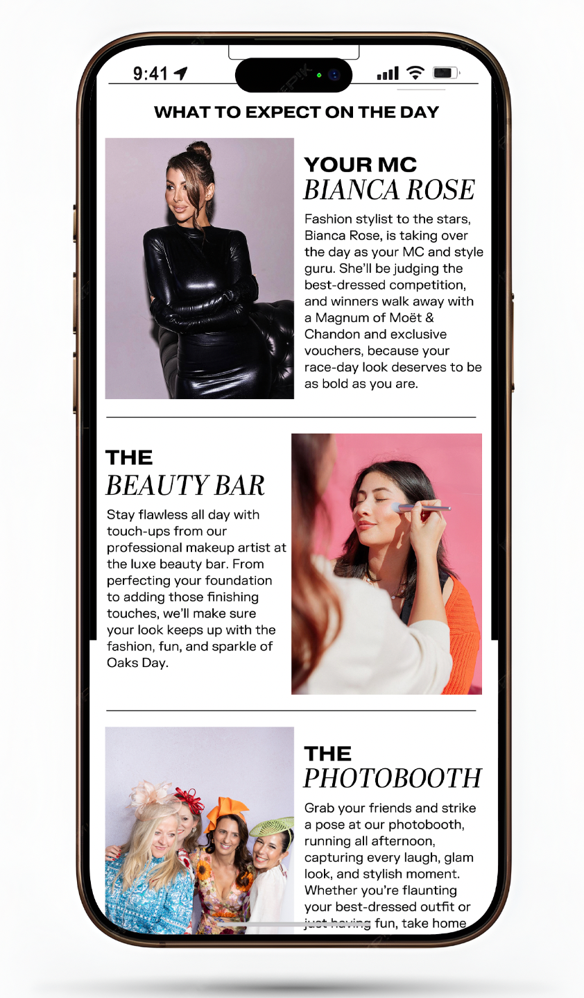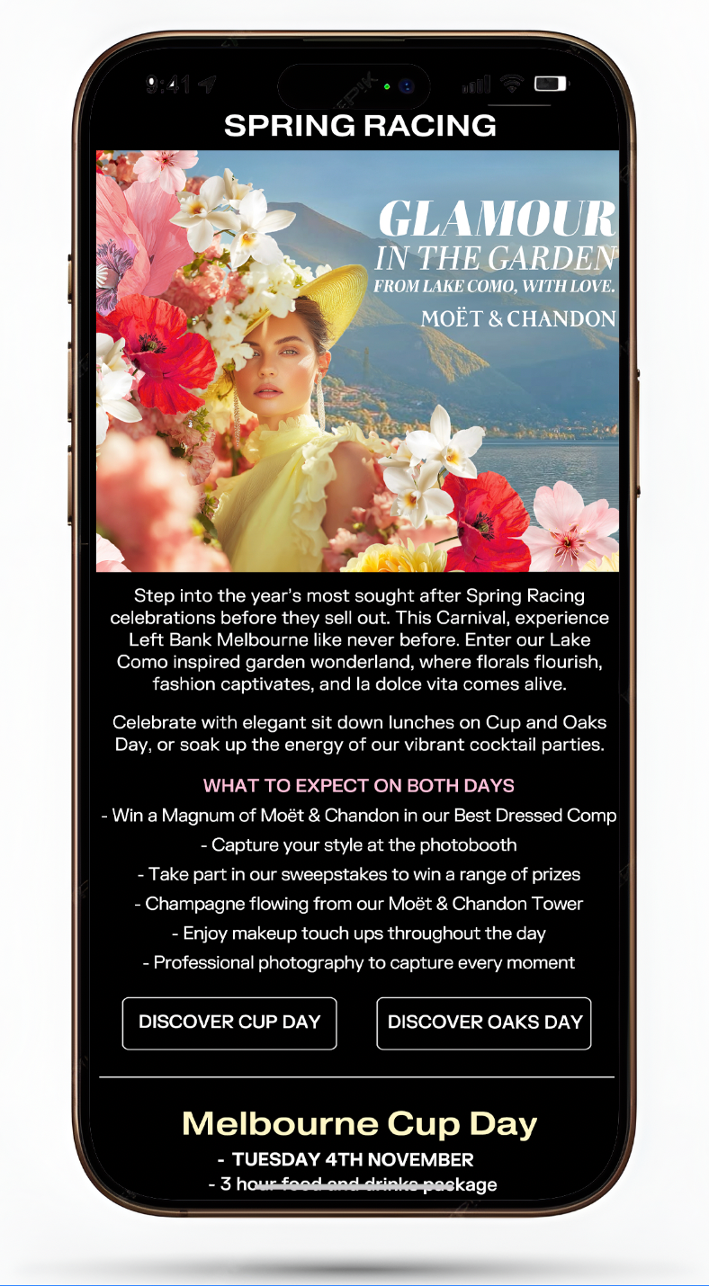 The concept, campaign name, visual identity and all copy were developed in-house. The Lake Como direction was a deliberate move away from the standard Spring Racing playbook. Most venue campaigns lean heavily into race day imagery and it was starting to look the same everywhere. The editorial angle gave the campaign a fashion-forward quality that made it genuinely shareable.