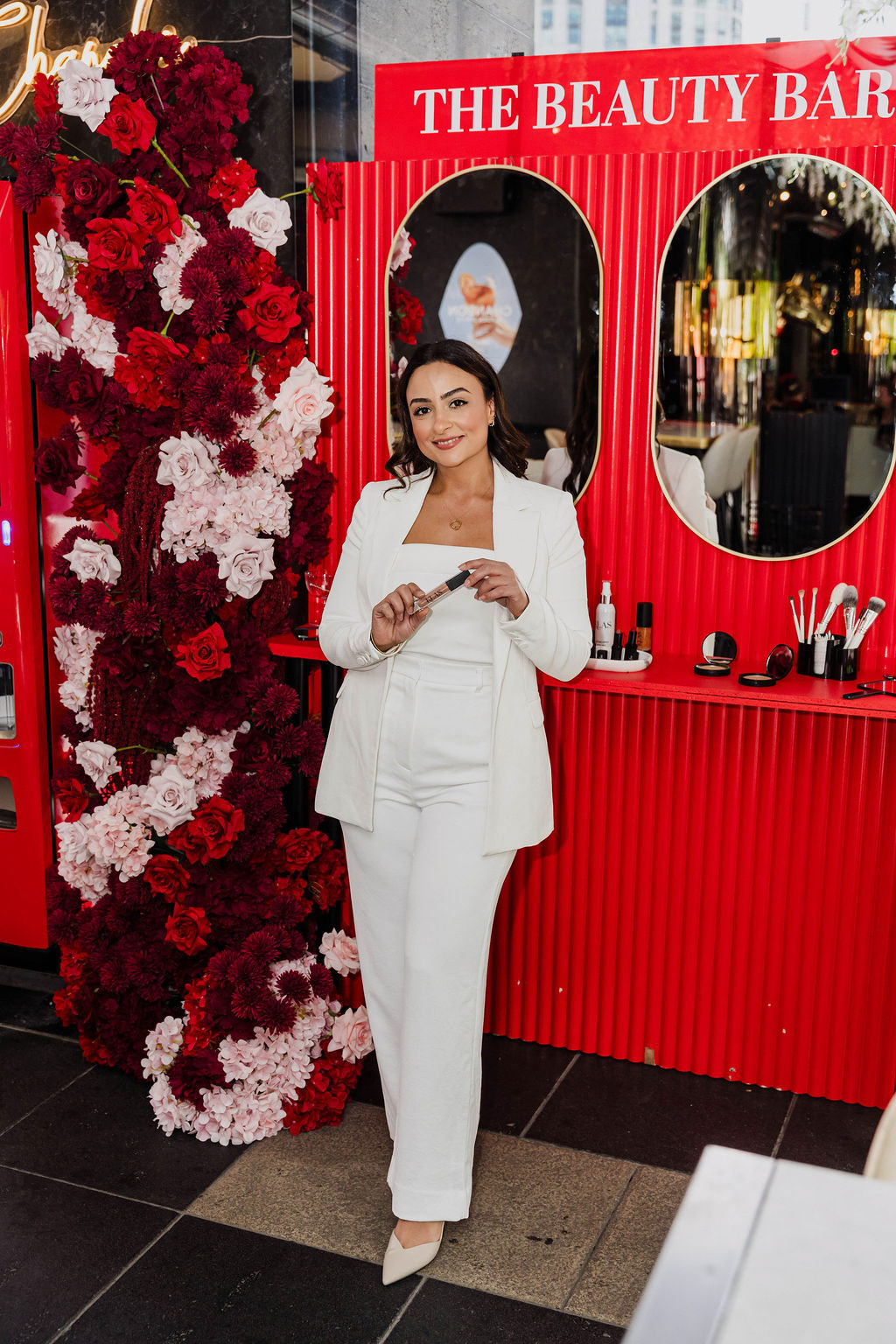 The Beauty Bar, the red corrugated structure, oval mirrors and floral installation, was designed and built entirely in-house. It was one of the most photographed activations across both days.